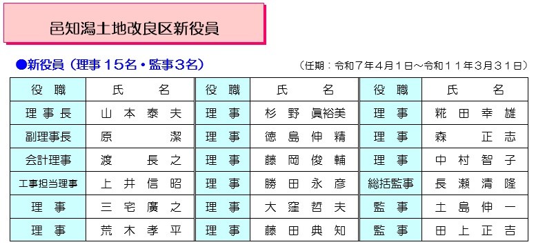 令和7年3月1日通常総代会にて任期満了による役員改選が行われ、理事長には引続き山本泰夫氏が選任されました。