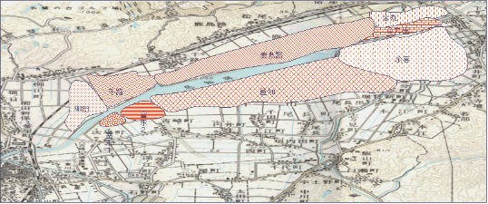 今から約340年前の江戸初期、干揚場や浅瀬を人工的に早くつくることを思いついた《吉野彦助》は、大雨の日に人夫を連れて飯山川の上流に入り、崖を削り土砂を川に投げ入れて流す「川流し」と呼ばれていた方法で、生涯780石(当時、約0.1haで1石の米がとれたようです。)の水田を開発しました。