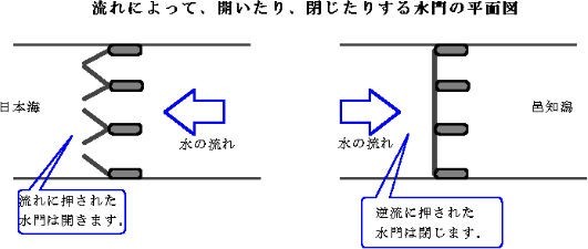 海が荒れると海水は波を伴って羽咋川を逆方向に勢いよく流れます。その流れの力を利用して水門がひとりでに閉まるよう工夫したのが逆流防止水門です。